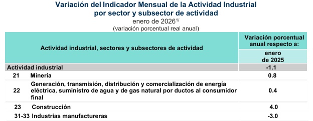 El instituto Nacional de Estadística y Geografía (INEGI), informó que durante enero de este 2026 el Indicador Mensual de la Actividad Industrial (IMAI), se colocó en 100.3 puntos, lo que implicó un descenso de -1.1 por ciento respecto al mismo periodo de 2024, la mayor caída a tasa anual para un mes similar desde enero de 2008, cuando el indicador cayó -5.2 por ciento, en el marco de la crisis inmobiliaria global.